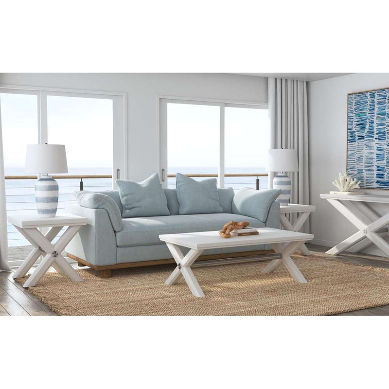 The Nadine Cocktail Table features a coastal contemporary inspired design that is constructed with solid wood and veneers in a bright white oak finish the table base features a heavy octagonal shaped X-base and a brushed nickel finished metal cross-bar. Finish: bright white, brushed nickel. Material: solid wood, wood veneers, metal..