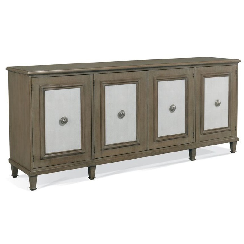 Classic four door cabinet with inset shagreen doors, three adjustable shelves and a tray drawer with silver liner. Functional in a dining room or an entertainment area. The framed in shagreen panels are appointed with a handsome medallion pull. With choice of custom finish and color of shagreen the customizable opportunities seem endless.