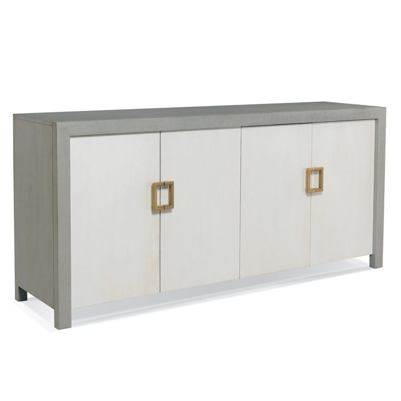 Clean-lined transitional four door cabinet with euro hinges. Each pair of doors houses a pull-out tray and an adjustable shelf. This cabinet has been designed for a dining area but would be just as functional as an entertainmenet unit with minor modifying for wire management.
