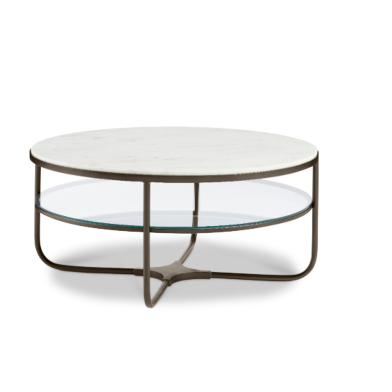 The Nash Cocktail Table is a striking centerpiece for refined interiors, combining luxurious materials with a sleek, modern silhouette. The round tabletopcrafted in marblesits elegantly above a metal base in aged bronze, while integrated glass details bring a layer of visual transparency and sophistication.
