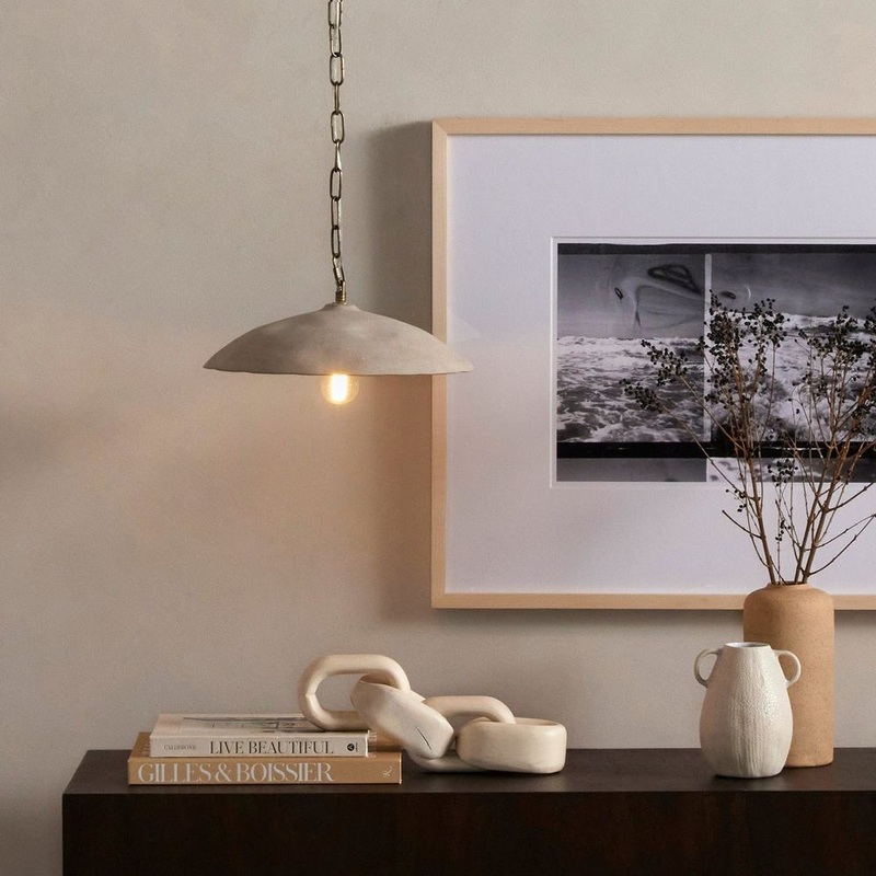 Organic in spirit. A light sand-colored talavera pendant pairs with an iron chain for a spare but impactful look.