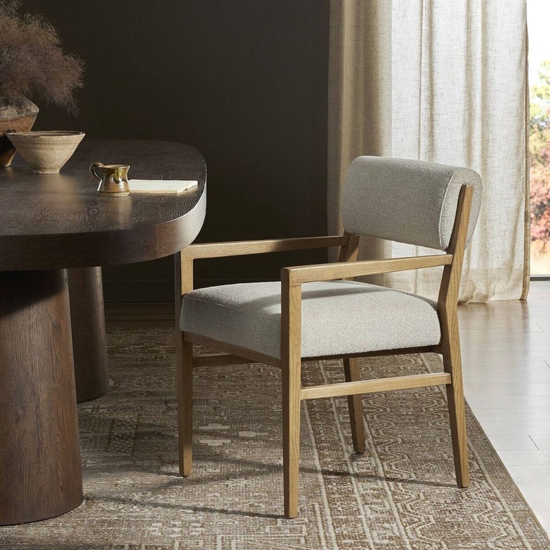 A pared-back frame of light, smoked oak frames the boxy cradle seat and supportive back of this midcentury-inspired dining armchair. Upholstered in a tweed-like neutral flax made from recycled olefin.