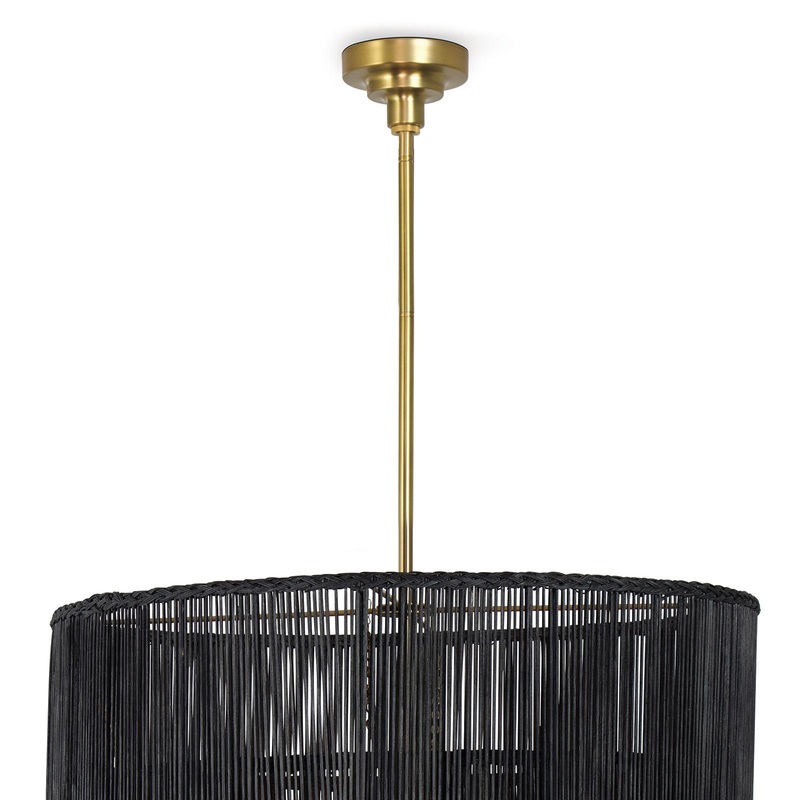 Three layers of woven rattan drum shades with braided edges tier upwards, concealing a double bulb torch fixture with natural brass finish. The edges of the Nimes Chandelier shades ebb and flow, and the fixtures 11 bulbs evenly diffuse light with discreet elegance. This large fixture is a statement piece for any room in the house.