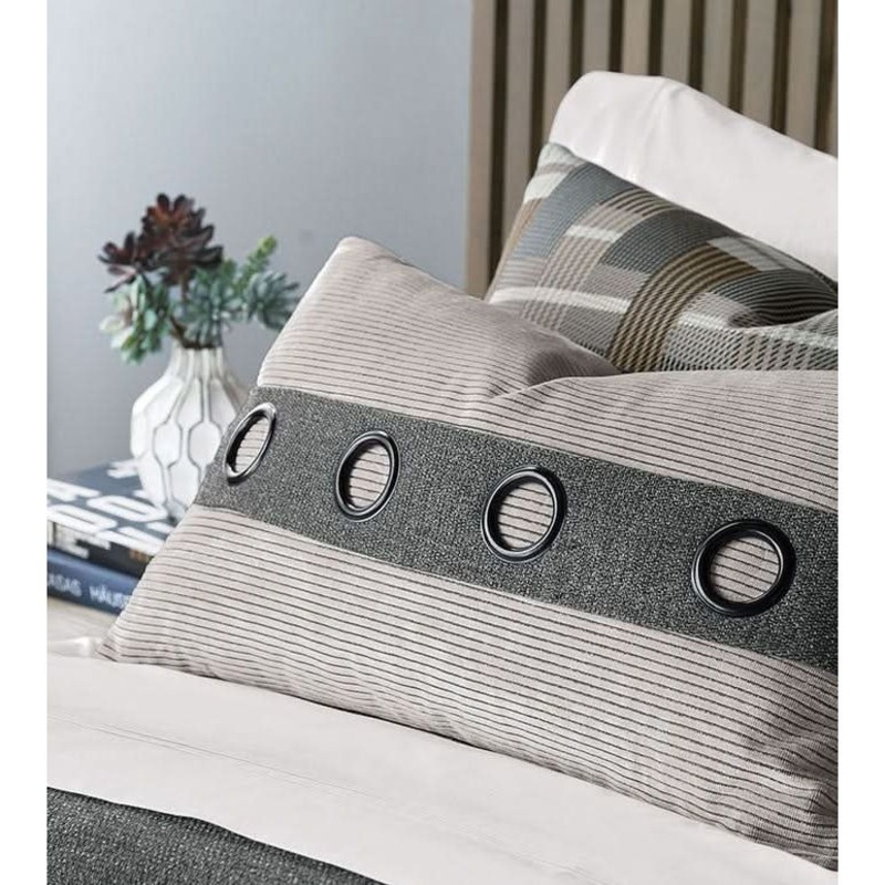 - Velvet decorative pillow in Raya Stone with Grigio Smoke and grommet detail