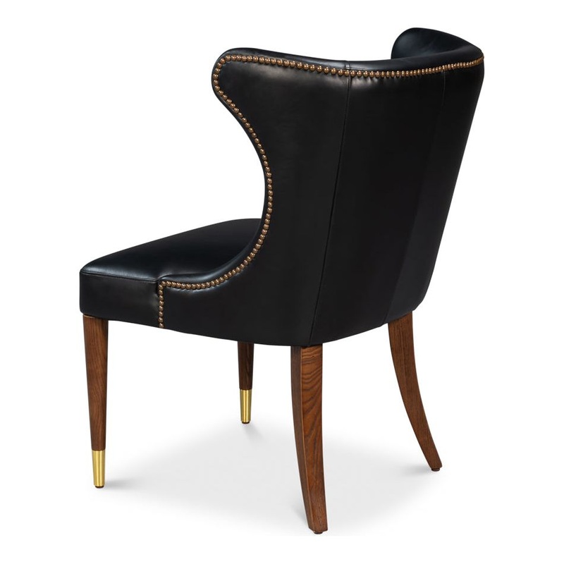 Description: The Norwood dining chair showcases a sophisticated design with a winged barrel back, elegantly accented by brass nailheads and upholstered in rich top-grain leather. Its rich walnut-finished legs with brass accents provide a refined touch, ensuring both comfort and style to elevate the dining experience.
