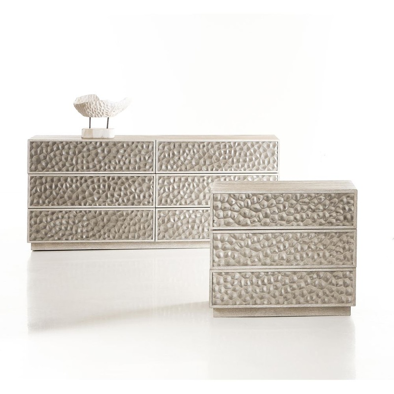 Description: Hammered cast aluminum defines a new modern primitive design for the drawer fronts on the Olmo dresser. The textural look is balanced by a light wood Trevin finish on the case and plinth base. The metal inlays on the six push-to-open drawers are finished Graphite.