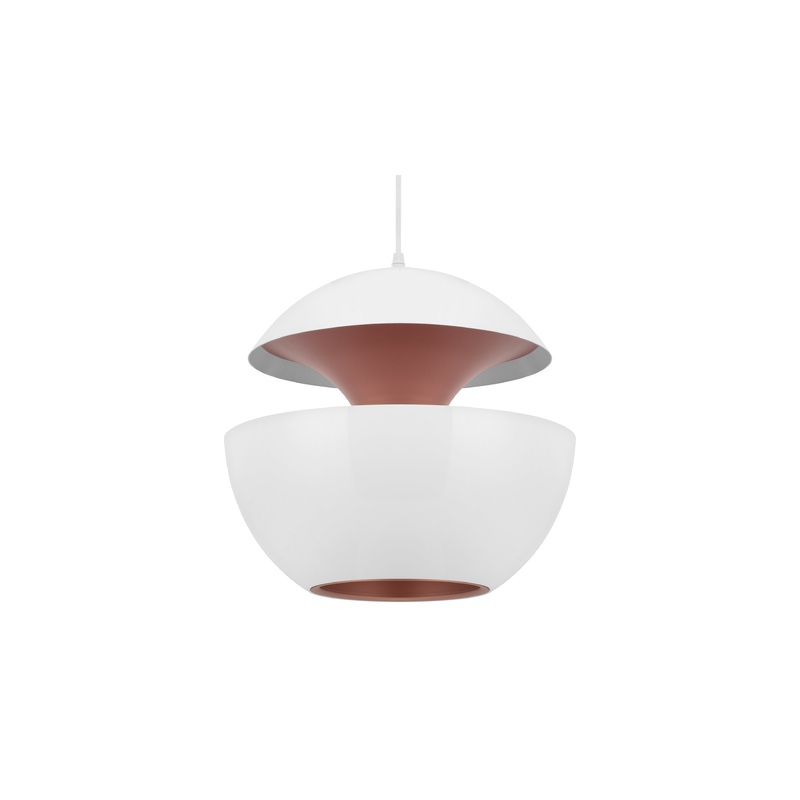 Resembling a delicate sphere suspended in air, the Omena Pendant Light captivates with its understated yet captivating design. Its outer shell, made of lacquered aluminum, boasts a sleek and modern appearance, while the inner surface, coated in a reflective copper finish, diffuses light in a soft and gentle manner.