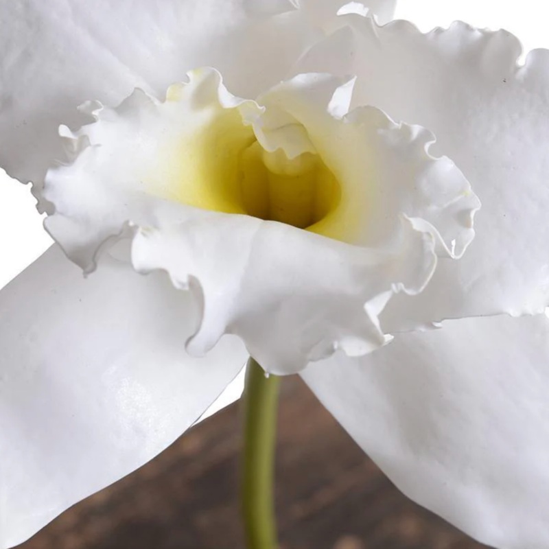 Indulge in the timeless beauty of the Orchid Stem – Cattleya. These faux fresh stems feature one large white flower with a pale yellow throat, adding an elegant touch to any space. Each 18″ stem is clear white and remains vibrant, making them perfect for indoor use. These stunning stems are a must-have for any luxury interior.