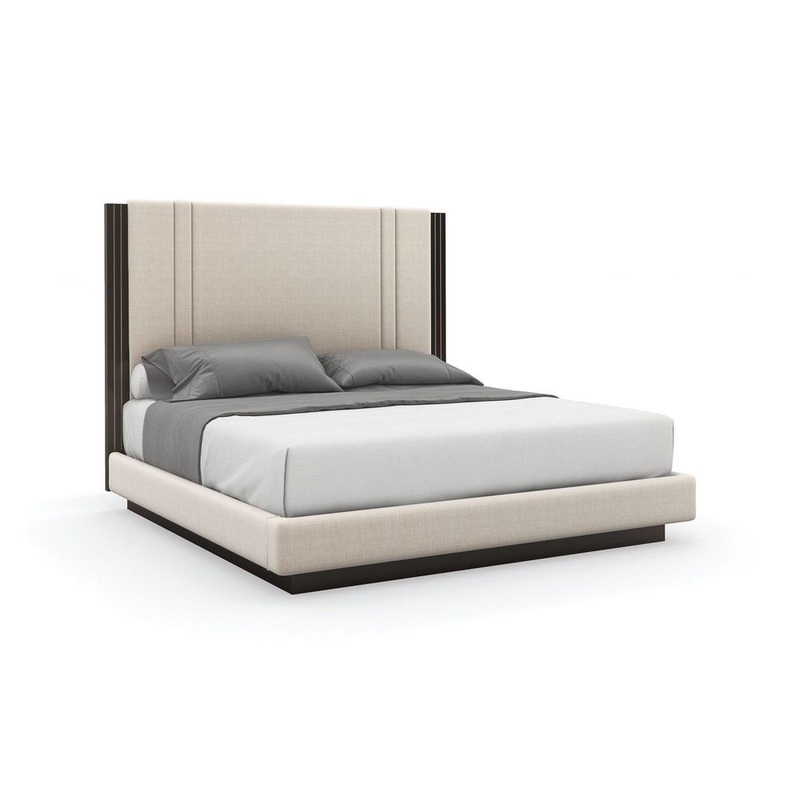 Dashing and distinctly modern, this architecturally inspired bed introduces an updated take on a classic Parsons style. Its dramatic headboard is upholstered in a light-toned performance fabric, richly contrasted by Dark Chocolate trim. An inlaid metal accent in Champagne Gold adds warmth and a sophisticated detail. Fully upholstered side rails and footboard are beautifully balanced on a Dark Chocolate plinth base.