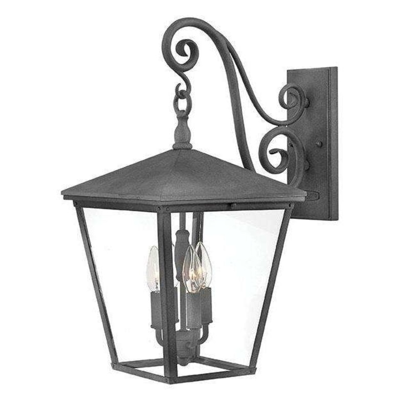 • Trellis is a traditional European hanging wall lantern design available in either an Aged Zinc finish with clear glass or a Regency Bronze finish with clear seedy glass. The large scroll arm detail, cast loop finial and true rivet detail create a refined elegance with Old World charm.