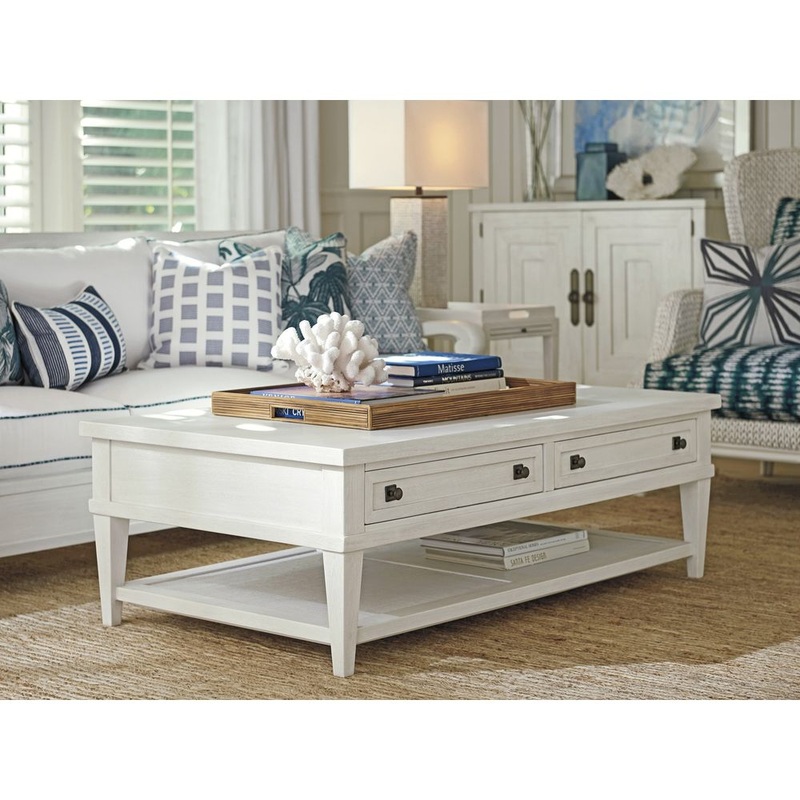 Marketing Copy: Ocean Breeze offers a fresh take on relaxed coastal living with transitional designs crafted from quartered mahogany in a beautiful shell white finish. Natural materials add textural interest and a feel of authenticity to the collection, including leather-wrapped rattan, woven raffia, braided lampakanai and Santa Cruz marble. Custom hardware and metal bases are finished in aged pewter, reinforcing the casual spirit of the designs. Unique upholstery silhouettes incorporate woven materials and intricately carved wooden frames for a sophisticated look that retains the casual essence of the coast. Soothing color palettes include seaglass, citrine, coral, marine blue and crisp white. The Tommy Bahama brand is iconic for its interpretation of casual elegance, and Ocean Breeze offers an inspired interpretation of refined coastal living.