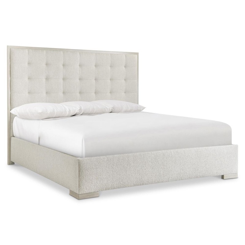 Description: An upholstered headboard panel on the Paltion bed adds a modern style to a traditional design with buttonless tufting. Upholstered side panels and footboard add texture that perfectly complements the wood frame and feet in Nebbia finish.