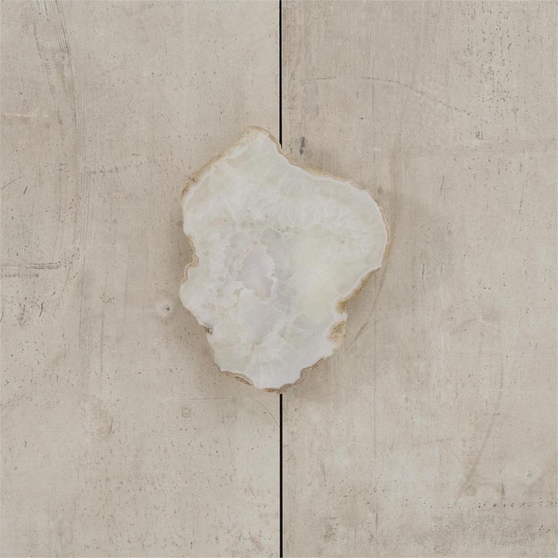 The Paradise Sideboard showcases an innovative blend of natural materials and contemporary design. Crafted from beech wood with a beautiful tiza gesso finish, the piece features four drawers and two cabinet doors affixed with handles of white agate slices. Stunning silver accents line the facade, contributing a tasteful sense of opulence.