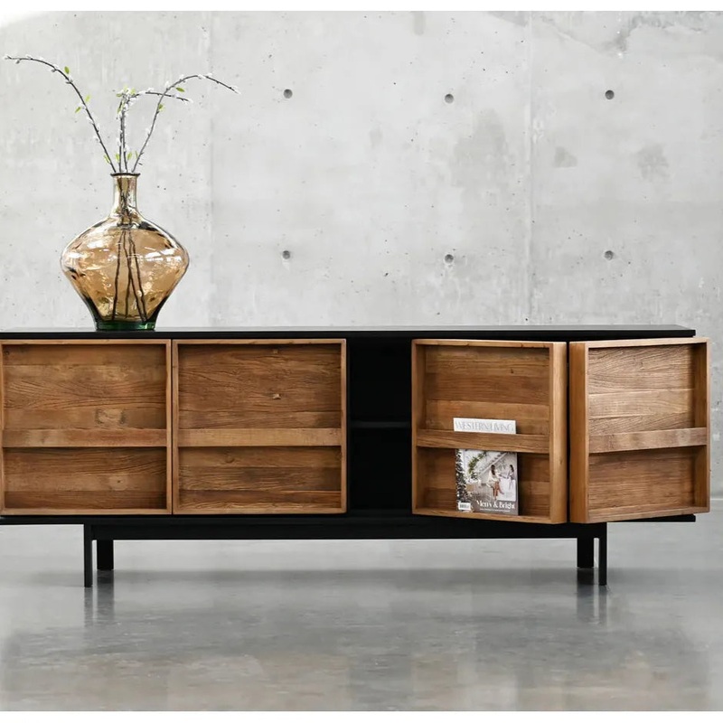 The Passage sideboard combines sustainability with contemporary design, featuring doors crafted from reclaimed elm wood paired with a sleek matte black body and top. Its distinctive accordion-like open and close design adds visual interest, while the eight interior shelves provide ample storage for books or discreetly hiding clutter, making it a practical and stylish addition to any room.