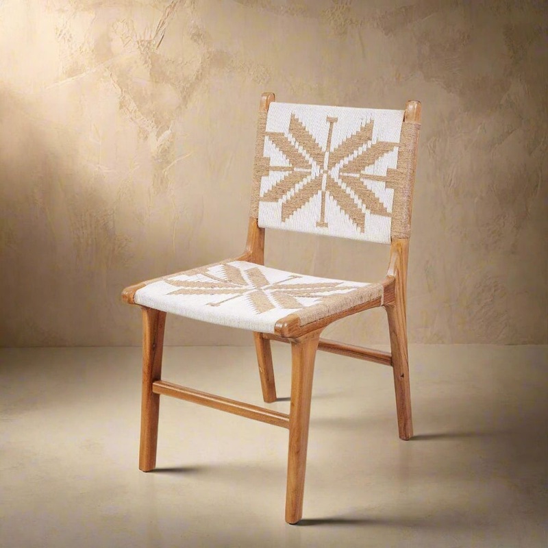This charming side chair will shine in any dining or kitchen space. The simple frame design lets the patterned seat and back be the star of the show. Crafted from woven linen and jute rope the seat and back have a traditional starburst pattern.