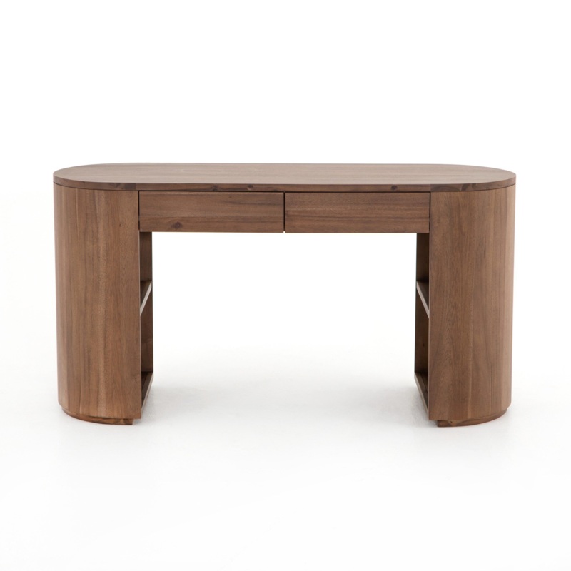 Finished in a rich caramel brown, acacia forms a pill-inspired shape to nod Eighties-era design. Half-cylinder bases feature open interior shelving, with two top pencil drawers to keep supplies handy.