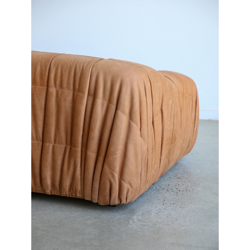 This rare mid-century Italian sofa is the iconic Piumino by Jonathan De Pas, Donato DUrbino, and Paolo Lomazzi for DellOca, upholstered in supple cognac leather. Its soft sculptural lines, gathered folds, and inviting proportions embody 1970s Italian modernism at its best. A luxury design piece, it combines playful aesthetics with sophisticated craftsmanship, making it a statement addition to any interior.