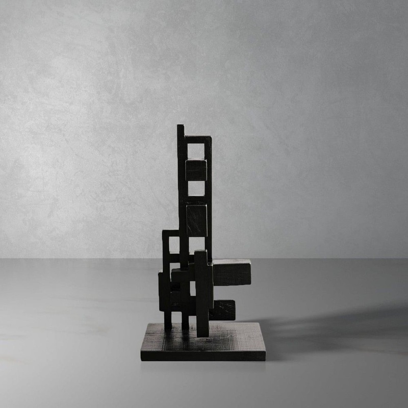 This angular sculpture is expertly crafted from teak and given a black finish. This piece has an industrial air to it, resembling a pixelated rifle.