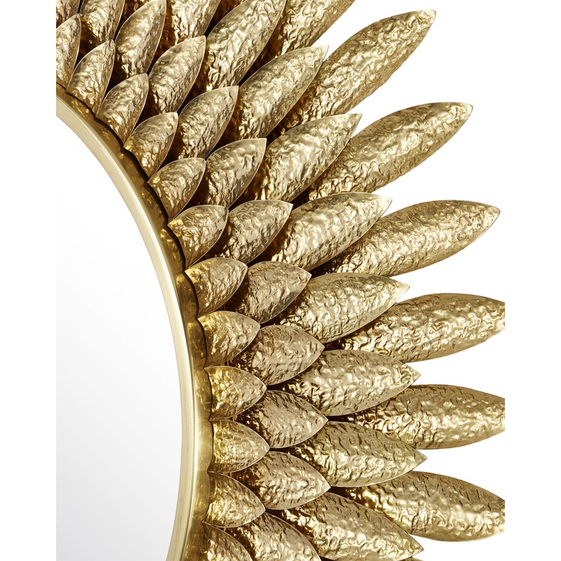 Description: A beautiful burst of brass feathers, the Plume Round Mirror is a remarkably artistic creation, with each of the hundreds of hand-cut and hand-hammered faux feathers affixed to the frame one after another by artisan hand. The rows graduate from largest to the smallest as they move toward the mirrored glass.