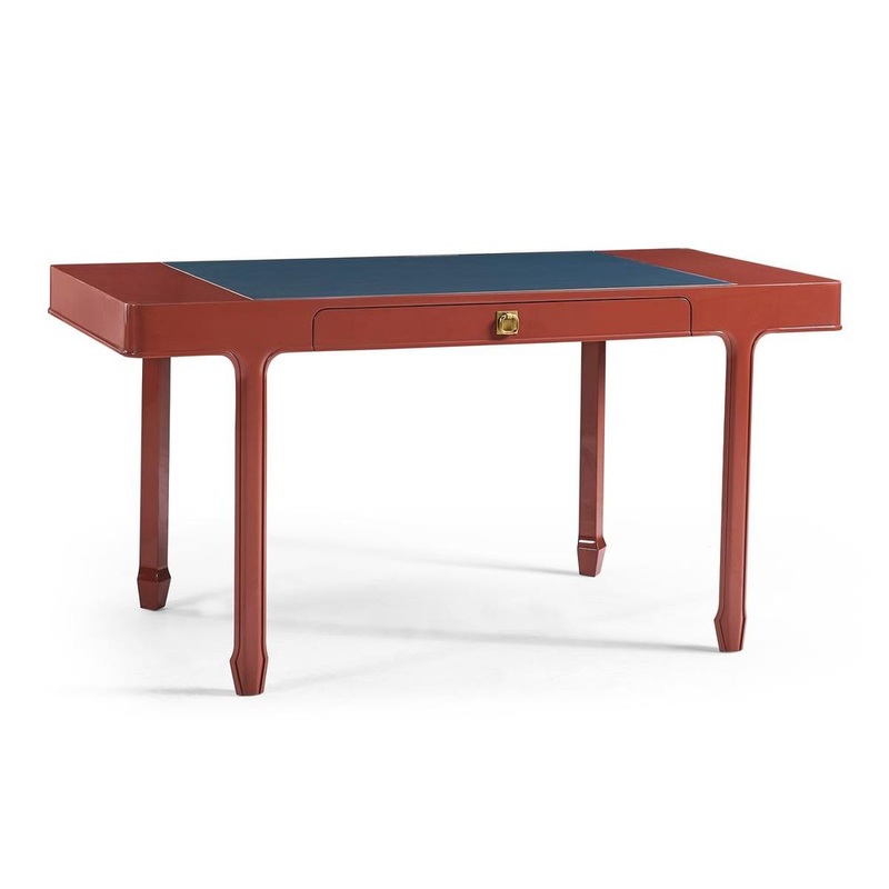 The Polly Rose Desk combines sleek modern design with bold, vibrant details to create a striking workspace. Finished in a high-gloss bold red lacquer, the desk exudes contemporary sophistication. The tabletop is inset with luxurious royal blue leather, offering a refined contrast and a stunning visual statement. With its eye-catching color and functional elegance, the Polly Rose Desk is the perfect centerpiece for any home office or study, bringing both style and practicality to your workspace.