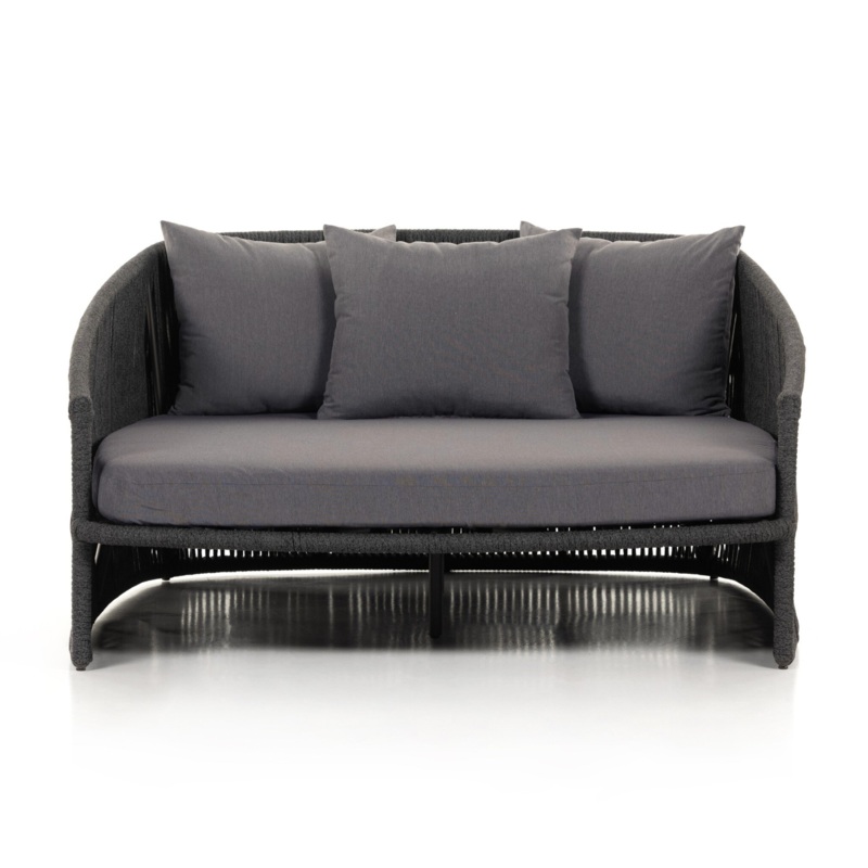 The perfect place for outdoor daydreaming. A beautiful rope-based design is woven across a durable aluminum frame in a rich bronze finish. Topped with a wide cushion and throw pillows, all upholstered in 100% olefin, known for its UV-resistant, water-repellent and quick-drying abilities. Cover or store inside during inclement weather and when not in use.