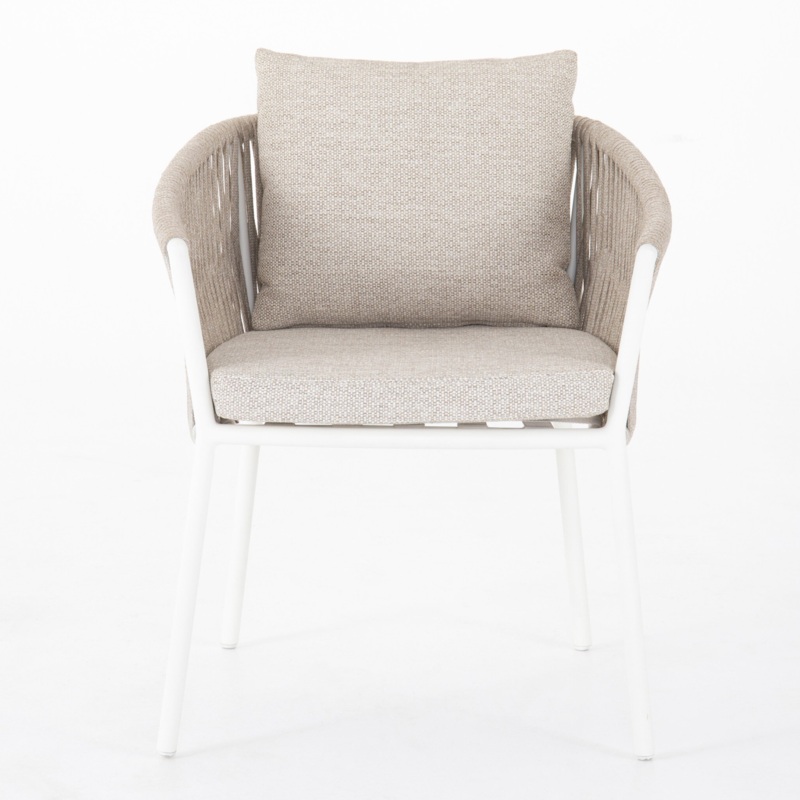 Add a dash of modernity to outdoor dining. Finished in a crisp, clean white, linear aluminum framing welcomes weather-resistant sand-colored cushioning, for a fresh, fluid look. Cover or store indoors during inclement weather and when not in use.