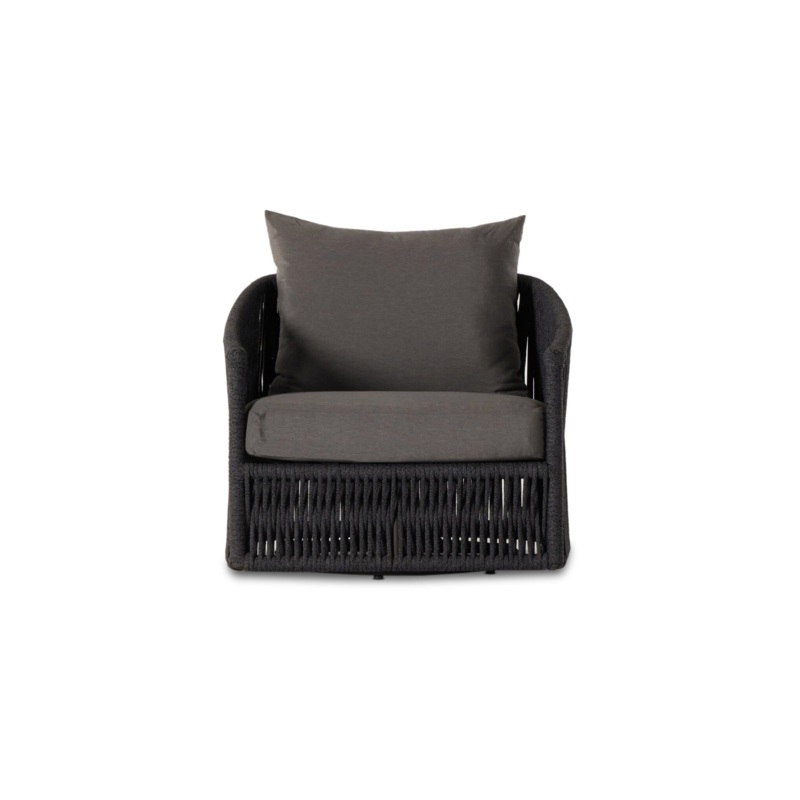 A beautiful rope-based design is woven across a durable, 360-swivel aluminum frame in a rich bronze finish. Topped with a wide cushion and throw pillow, all upholstered in 100% olefin, known for its UV-resistant, water-repellent and quick-drying abilities. Cover or store indoors during inclement weather and when not in use.