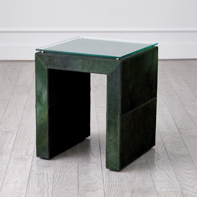 Description: The Posh Side Table is luxuriously wrapped in green hair-on-hide leather blending practicality with sophistication in your living space. The side table features antiqued brass-finished accents and a tempered glass surface.