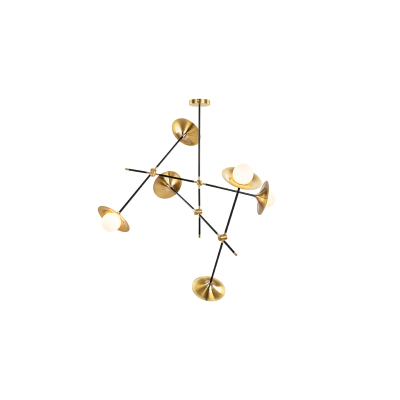 The Prater Chandelier features a metal construction with a contemporary and distinctive design. Its adjustable poles, which allow you to redirect light as needed, are finished in black to contrast with the bright brass finish on the shades, pivot points, and ceiling mount. The overall design is defined by its trumpet-like shades, which add a unique and eye-catching touch.
