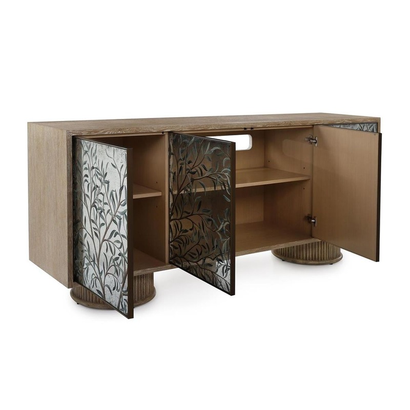 TheRadiance Credenza is a naturally inspired design statement with an elegant aura. Crafted from oak and celtis woods, the frame displays a Limed Oak finish with accents of Old Brass. Four push latch doors are adorned in stunning glomis panels that display sprawling olive branches. This gorgeous credenza features three interior compartments, each with an adjustable shelf.