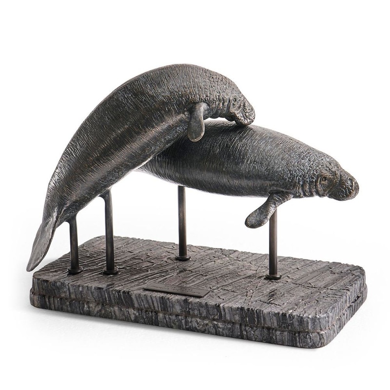 Celebrate the serene spirit of marine life with the Raised Manatee Bronze Statue. This sculptural duo captures the gentle grace of manatees in motion, cast in solid brass with a rich dark rustic waxed bronze finish. Elevated on a carved marble base, each form is thoughtfully mounted to evoke weightlessness and movement. Ideal for coastal-inspired interiors or collectors of sea life dcor, this statement piece blends craftsmanship and charm into a refined display accent.