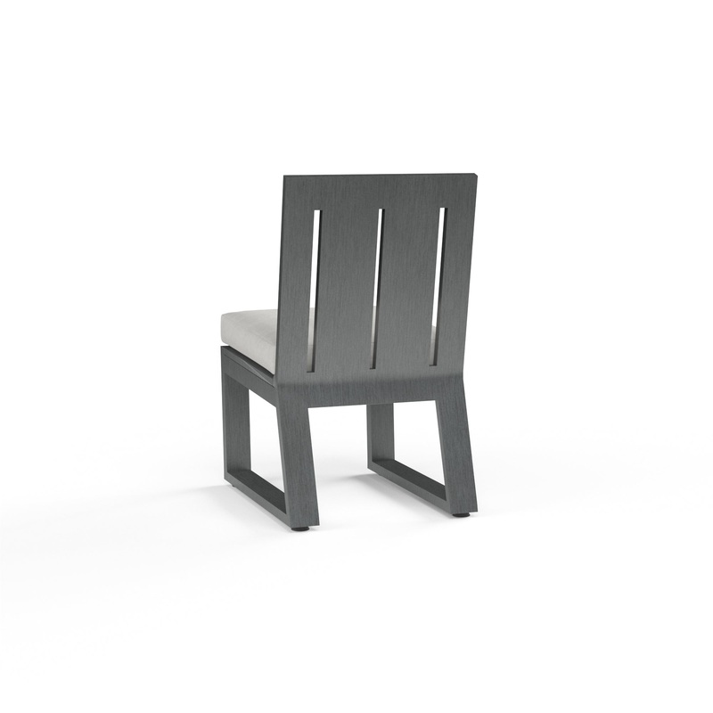 The Redondo Armless Dining Chair blends modern and industrial sensibly into one striking design, featuring a vertical slat back and linear frame, crafted in powder coated aluminum in a Slate hand-brushed finish.