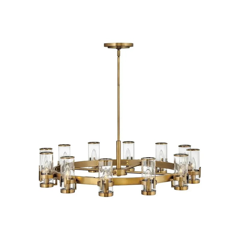 The Reeve chandelier balances sophistication with simplicity. The traditional low-profile silhouette is elevated by a wealth of elegant clear glass cylinders. Each glass is secured with a cast double-T bracelet matching the frame’s luxurious finish with a corresponding metal band at the top.