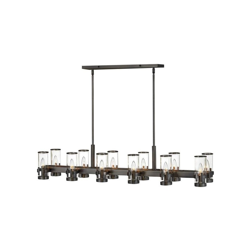 The Reeve chandelier balances sophistication with simplicity. The traditional low-profile silhouette is elevated by a wealth of elegant clear glass cylinders. Each glass is secured with a cast double-T bracelet matching the frame’s luxurious finish with a corresponding metal band at the top.