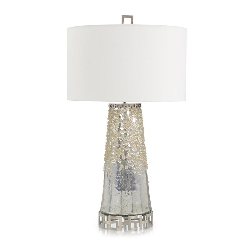 This silvered glass table lamp glistens and gleams with glass fragments encased in clear enamel with a custom designed base of open squares in Brushed Stainless Steel.