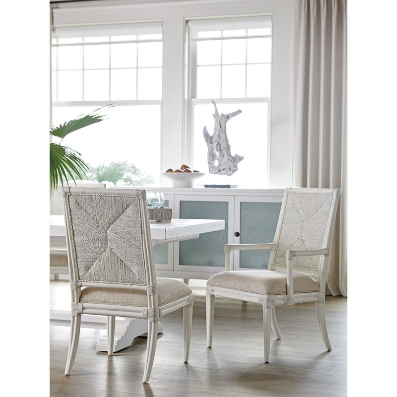 Marketing Copy: Ocean Breeze offers a fresh take on relaxed coastal living with transitional designs crafted from quartered mahogany in a beautiful shell white finish. Natural materials add textural interest and a feel of authenticity to the collection, including leather-wrapped rattan, woven raffia, braided lampakanai and Santa Cruz marble. Custom hardware and metal bases are finished in aged pewter, reinforcing the casual spirit of the designs. Unique upholstery silhouettes incorporate woven materials and intricately carved wooden frames for a sophisticated look that retains the casual essence of the coast. Soothing color palettes include seaglass, citrine, coral, marine blue and crisp white. The Tommy Bahama brand is iconic for its interpretation of casual elegance, and Ocean Breeze offers an inspired interpretation of refined coastal living.