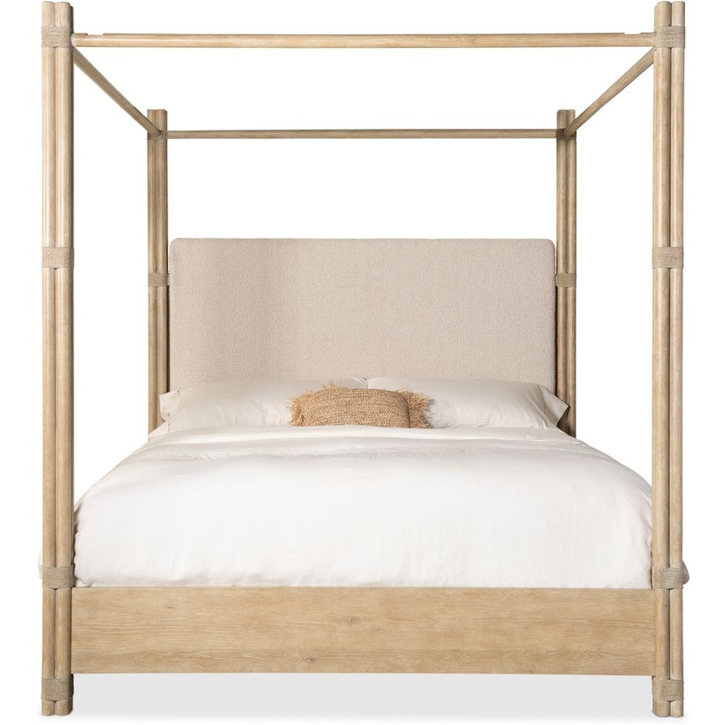 Description: Create a personal oasis inspired by tropical getaways with the Retreat Pole Rattan Upholstered Bed with Canopy. The dramatic bundled pole-designed motif with rope accents creates a laid-back luxury, complemented by the side rails crafted of Oak Veneers and finished in the sand-colored Dune finish, transparent by design to reveal the unique character of the wood veneer. The Neo Cream fabric on the upholstered headboard adds inviting softness and comfort. Includes headboard, footboard and rails.