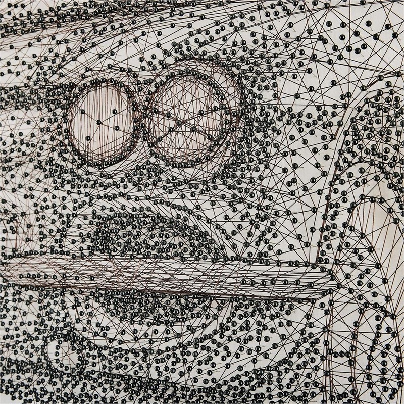 Retro Drive Panorama is a stunning love letter to the power and elegance of an iconic vehicle from years past. Shown in breathtaking detail, the car is brought to life through an intricate network of push pins and thread. This hand-made piece is held within a black wood gallery frame and may only be displayed from a horizontal orientation.