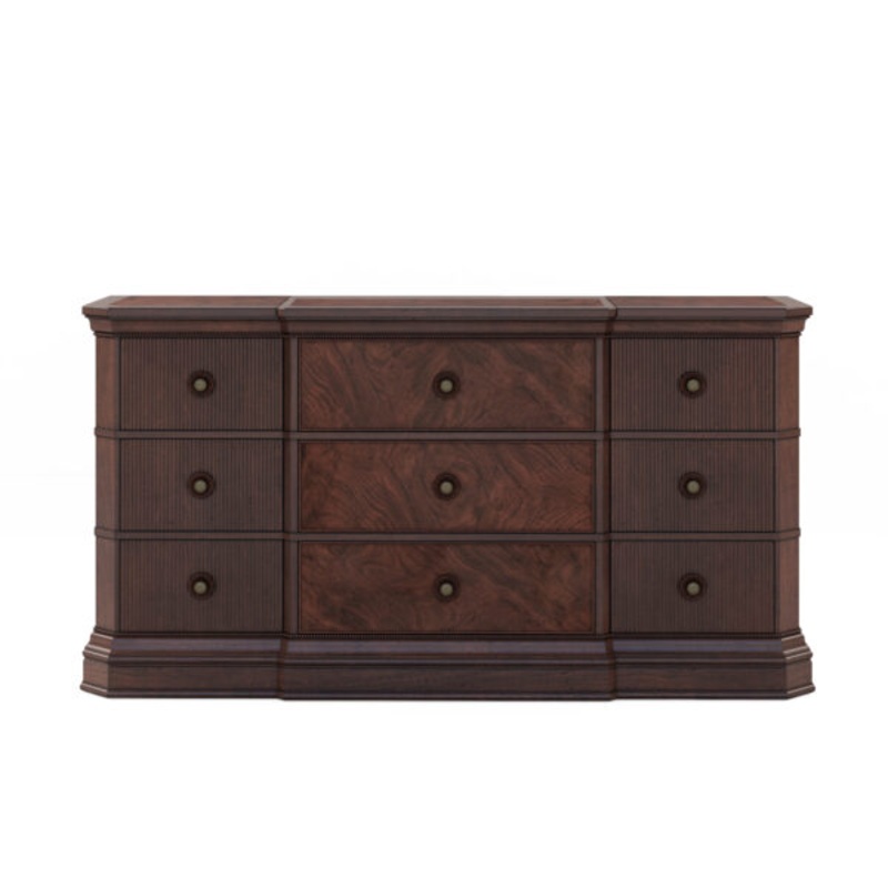 Description: With nine spacious drawers, the Revival Dresser provides ample storage space for all your clothing, accessories, and personal belongings. The top center drawer features a felt bottom lining, while the bottom drawers boast cedar lining, ensuring your items are stored safely and securely. Designed with practicality in mind, it features a hidden storage compartment with a felt bottom lining under the flip top. Perfect for storing valuables or treasured items, this compartment offers both security and convenience. The silhouette of this dresser features canted corners and wrap-around moldings, enhancing the traditional charm and elegance.