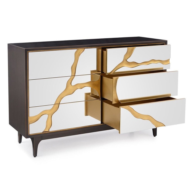Description: This six-drawer chest features modern beveled mirror fronts with an inset ravine pattern in a gold finish. The cabinet and base are finished in smoked oak.