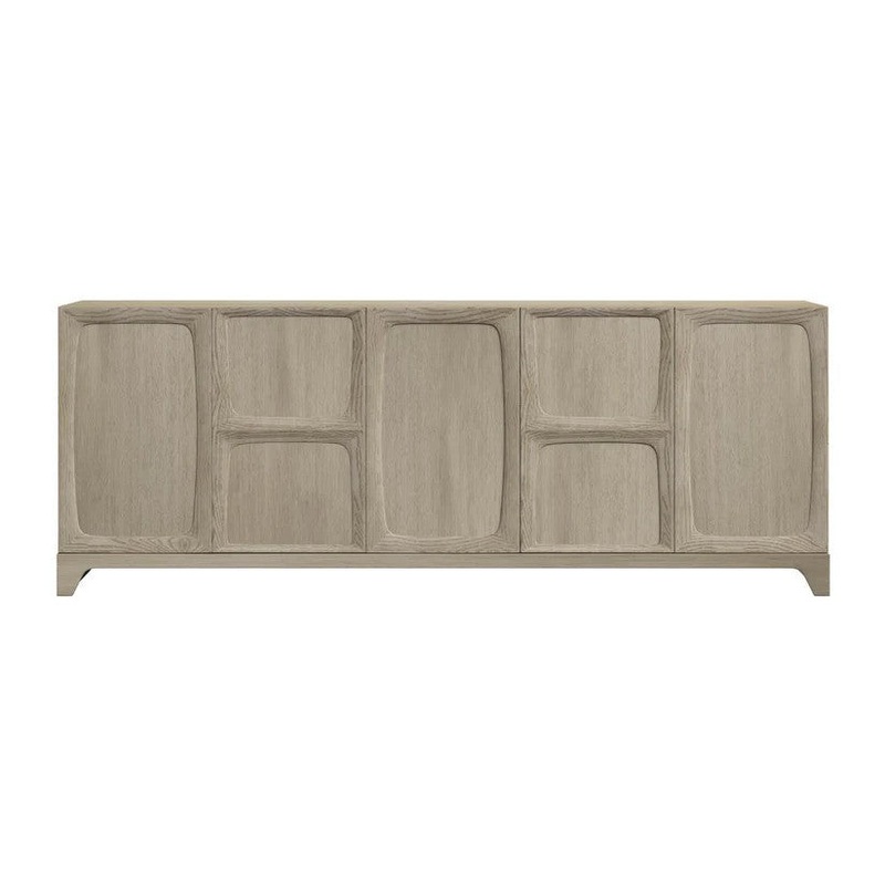 Crafted with inspiration from architectural elements and timeless aesthetics, the Rhaenyra Sideboard exudes sophistication and refinement in any environment. Meticulously constructed from luxurious sand beige oak veneer, its base features distinct vertical graining for a touch of artistry. Due to the organic nature of wood, expect natural variations in texture as well as subtle indentations and cracks. Each piece will also boast unique color and grain, as well as visible knots and burls that enhance its individual charm.