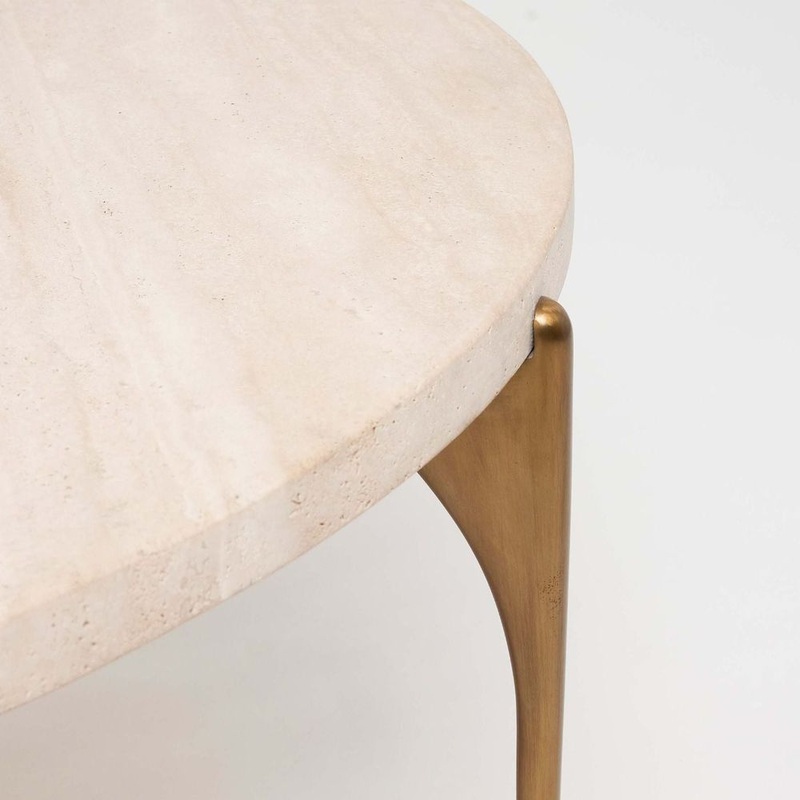 Subdued but stunning, the Richmond Cocktail Table boasts a fabulous raw travertine top and lithe stainless steel legs in golden bronze.