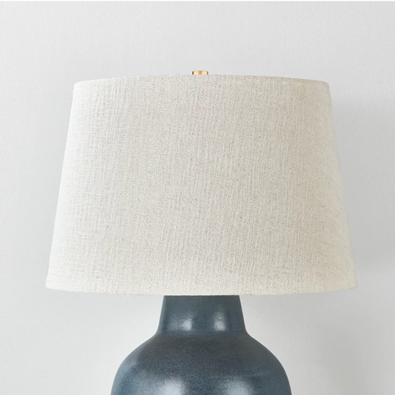 Echoing the hues of the sea, the cerulean Ridgefield instantly sets the mind at ease. Speckles on the surface of the ceramic base add visual texture, while the woven shade evokes a natural, coastal elegance. The Aged Brass hardware catches the eye when the lamp is illuminated, adding a polished note.