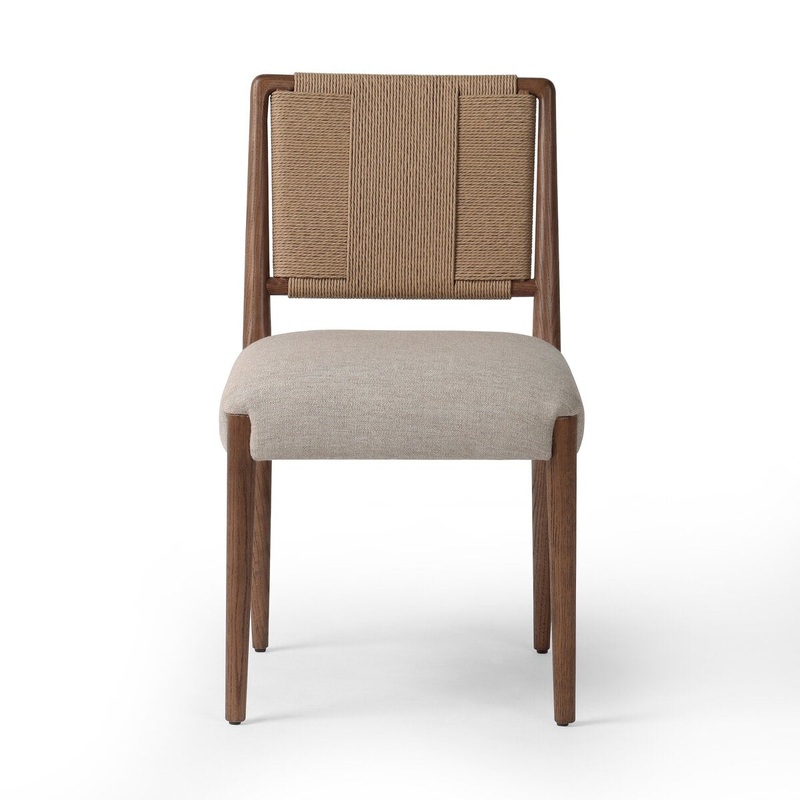 Indulge in the luxurious mix of materials that elevate this dining chair beyond the ordinary. With alternating weave patterns on the backrest, it adds texture and visual interest while the generously cushioned seat, upholstered in high-performance fabric, guarantees a comfortable and durable sitting experience. Made to withstand spills, stains, high traffic, and wear, this chair offers unmatched elegance and comfort for years to come.