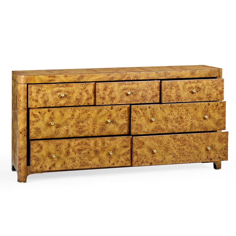 Description: Our Roland Dresser features a smooth top, rounded front corners, a shaped apron, three small and four large equal size storage drawers, round turned brass knobs, and brass accent foot plates; Rustic finish on Mappa Burl veneer.