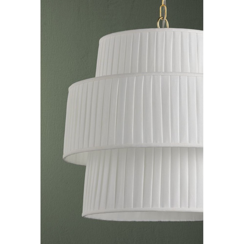 Description: Floating like a cloud, the soft pleated linen shades of Rya are light as air. The stacked silhouette recalls a tiered cake, lending this pendant its architectural feel. Suspended from an Aged Brass chain, this oversized beauty glows from within. Part of our Dabito x Mitzi Tastemakers collection.