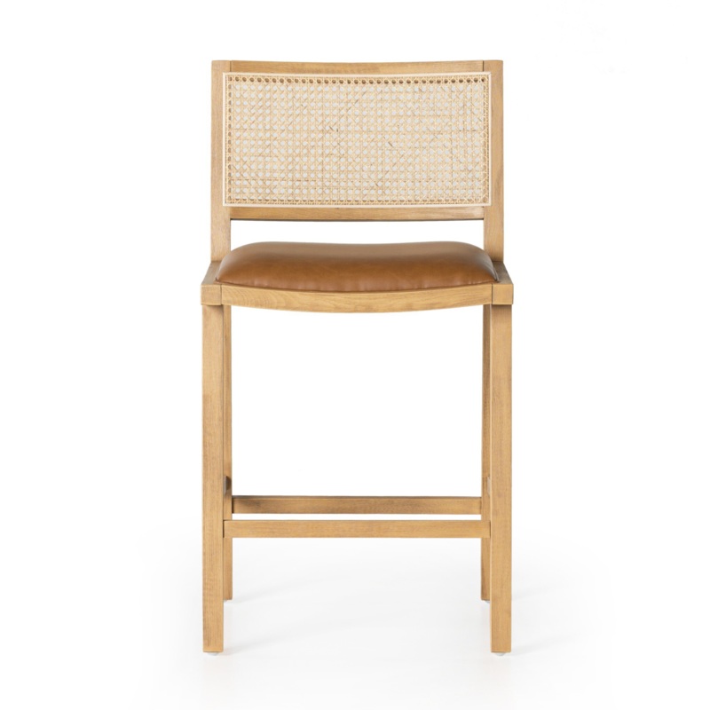 Mixed materials make the chair. Solid natural beech wood features a natural cane back for extra texture, while a butterscotch-finished faux leather seat serves total comfort.