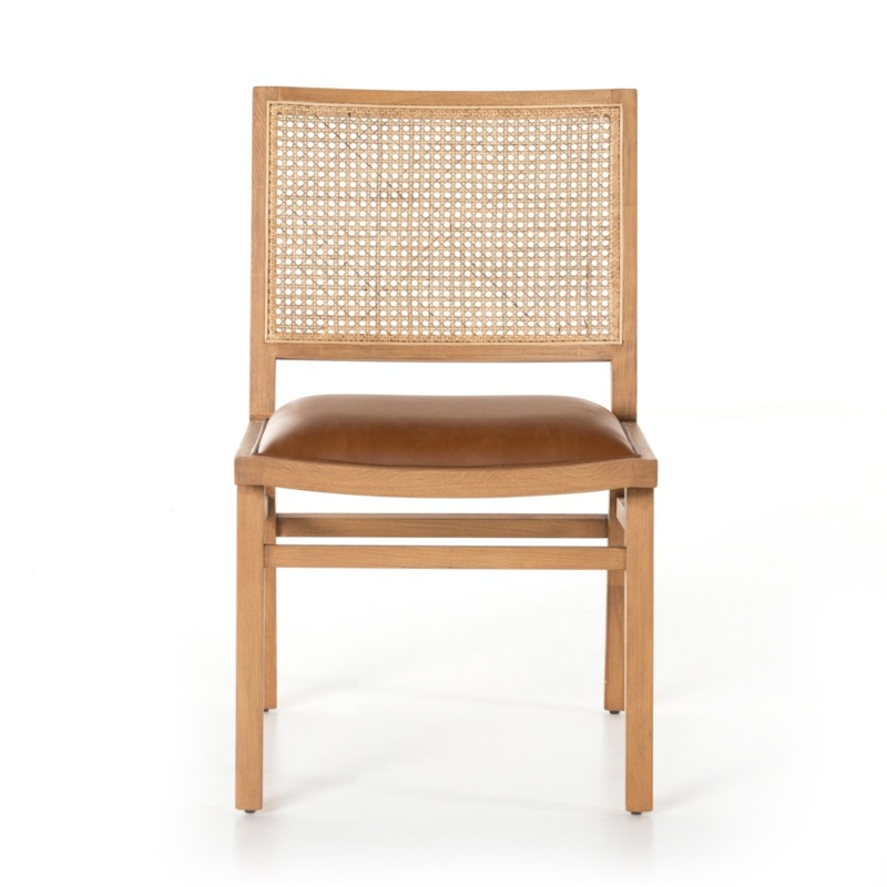 Mixed materials make the chair. Solid, sand-colored beech wood features a natural cane back for extra texture, while a butterscotch-finished leather seat serves total comfort.