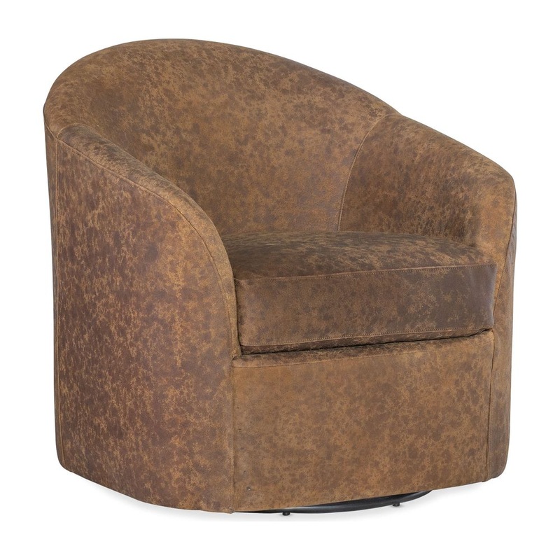 Description: Softly organic, the Sage Swivel Chair has a barrel back, sloped arms and loose seat cushion, covered in a subtly distressed brown leather.