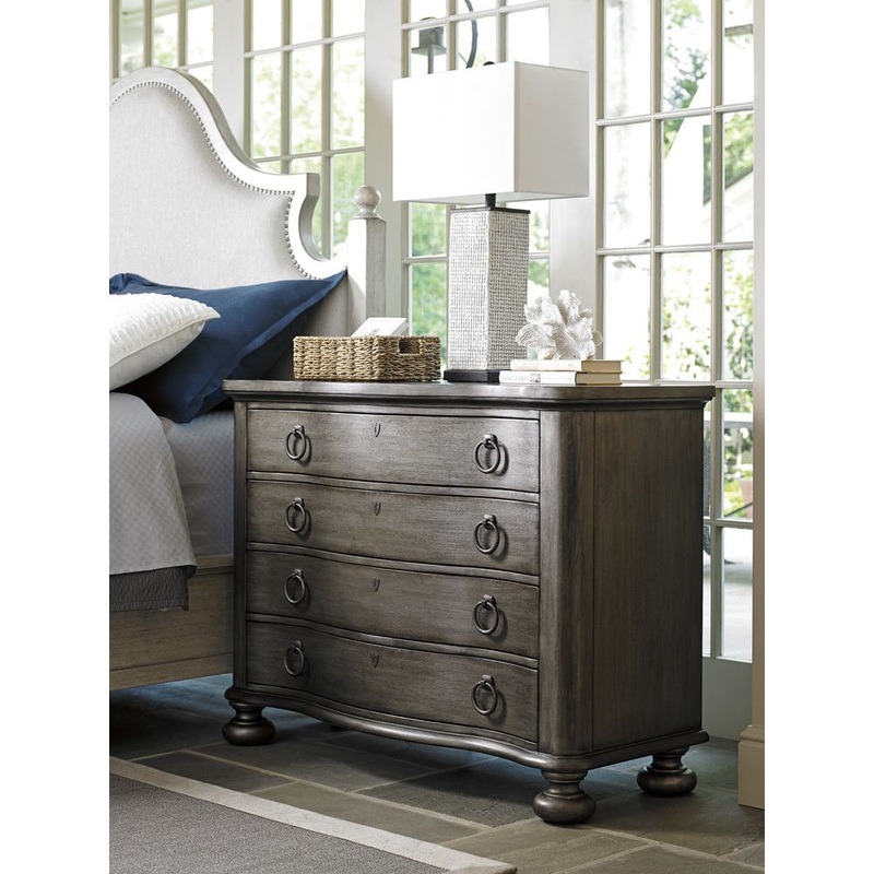 Marketing Copy: Today’s casual transitional styling blends lighter wood tones, natural textures and relaxed shades of ivory, taupe and gray, with designs that embody a feeling of laid-back sophistication. Oyster Bay offers a casual, comfortable and understated interpretation of luxe living.Designs feature an ecelectic mix of traditional elements like button-tufting, breakfront profiles and turned legs with more transitional features like geometric metal bases, burnished stainless steel tops and natural materials like rush seats and water hyacinth frames.Pulling the look together is a sophisticated oyster finish over the graceful lines of cathedral mahogany, lightly distressed, with custom hardware in an antique pewter finish. Getting away will always have its place, but nothing feels as good as returning to the comforts of home.